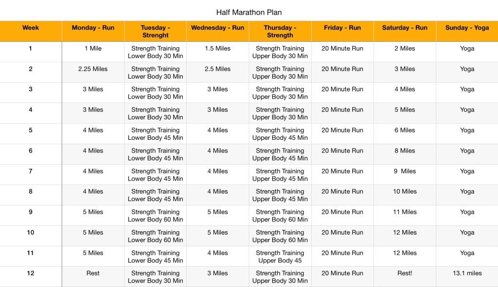 So as the person I am, I had to figure out a plan and document my progression. Below is the program I created to accomplish a half marathon (13.1 miles/21 km) over 12 weeks (that’s what the experts said to do), so I could close out the summer with a personal victory.